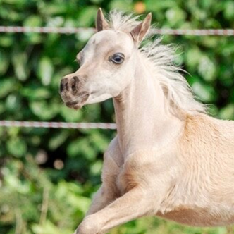 He is the perfect really tiny miniature with his short back, very nice neck, pretty face and he can really move! We expect a lot from this little colt!